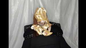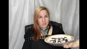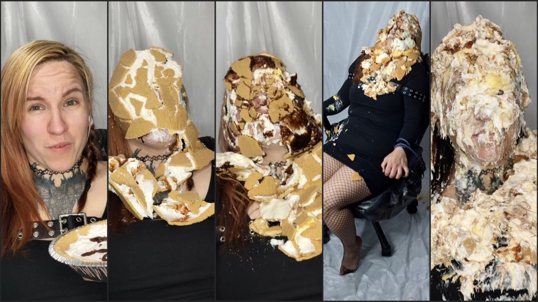 I'm wearing a nice black dress with fish net stockings. "Pie punishement in 3... 2... 1" and then I first take a nice chocolate cream pie to my face. "This is not punishement." Then I take a nice frosting cream pie to my face. It all starts to glop all over my chest. Then Louie stands behind me and gives me a thick cream pie sandwich smooshed into my head and face covering me into a heavy pie mess. Tilting my head back to make sure it sticks on my face, I take another cream pie. And then a really thick sloppy chocolate pie is given as I lie back a bit. I'm completely covered in pie slop by now! Some close ups of the chocolate slop dripping over me and my chest.