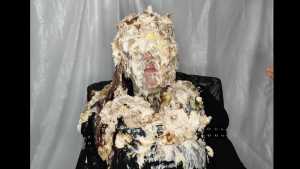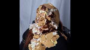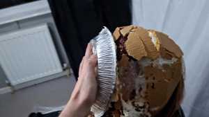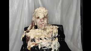 Next, there's a close up from the side of a syrup pie being smooshed slowly into my face. Some cream is smooshed onto me to make sure I'm completely buried under the creamy slop. Then a really thick fruity cream pie is launched into my tilted-back face. And then one is dropped onto to top of my head.